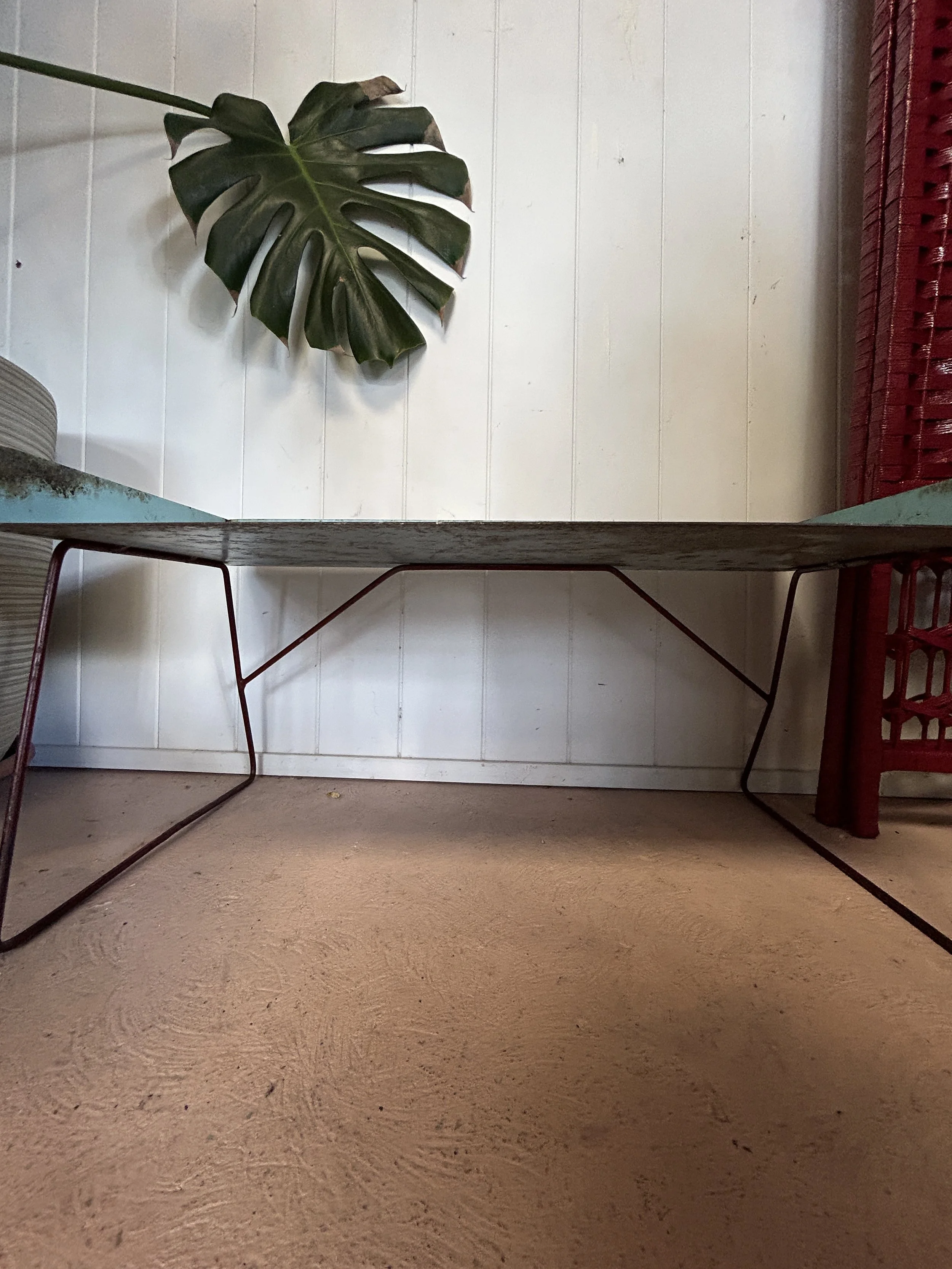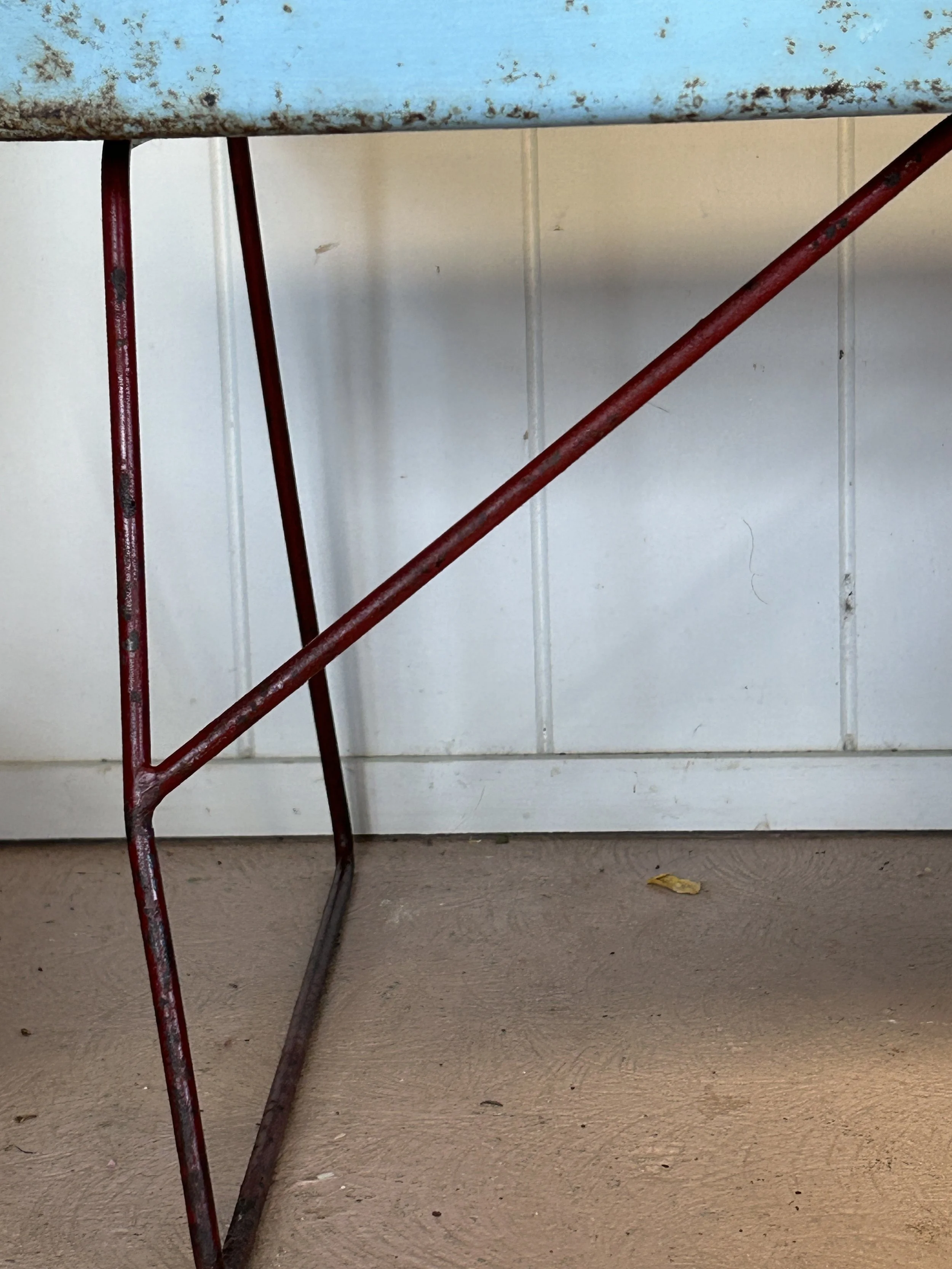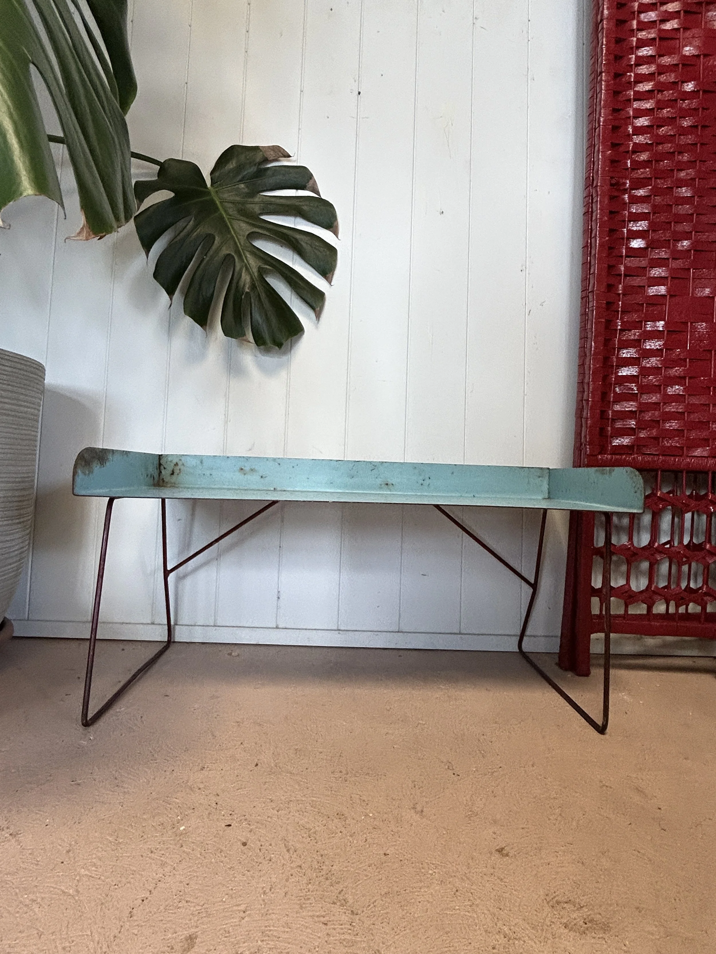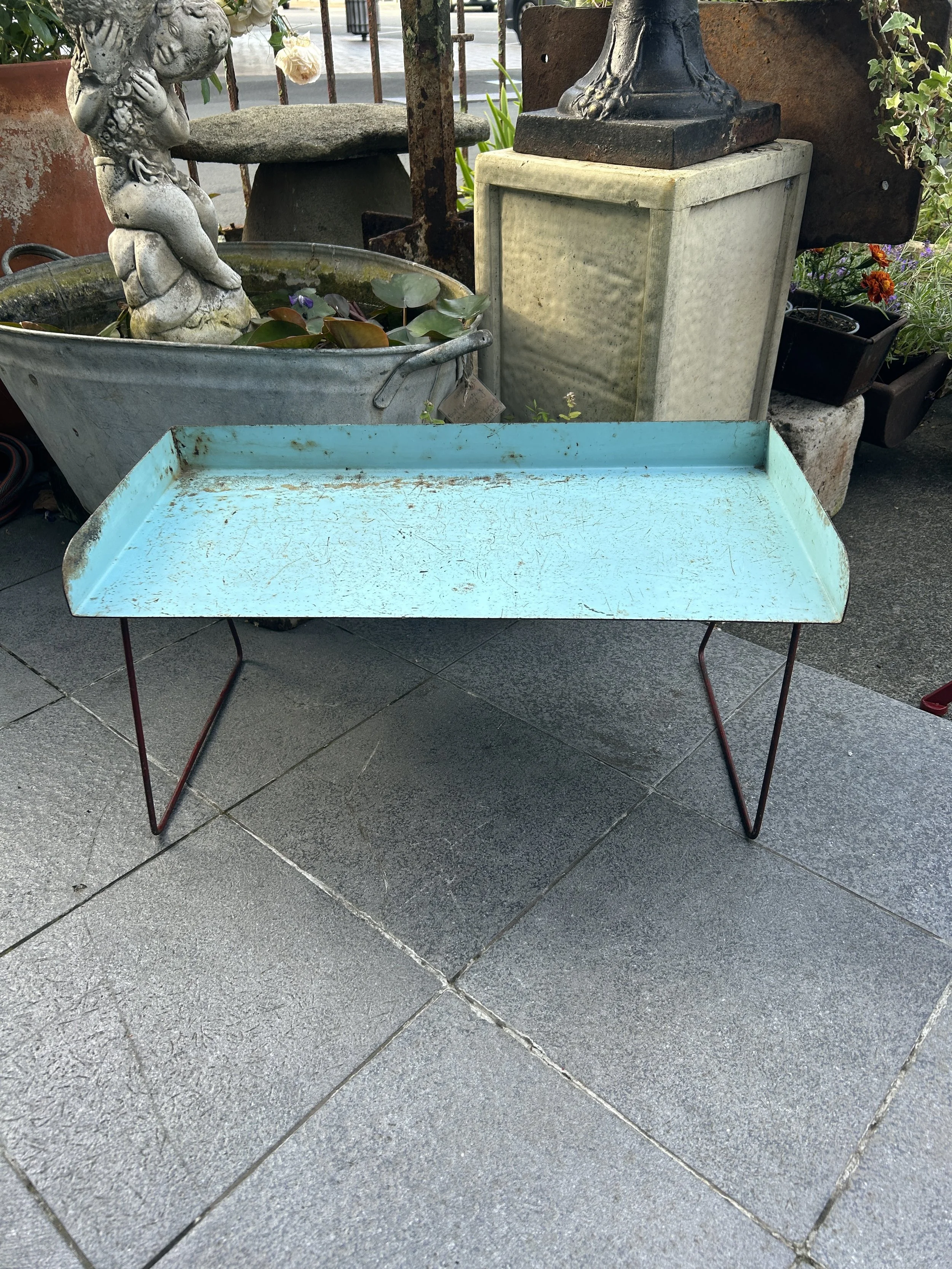 A quirky vintage metal freestanding blue shelf/tray with red legs.